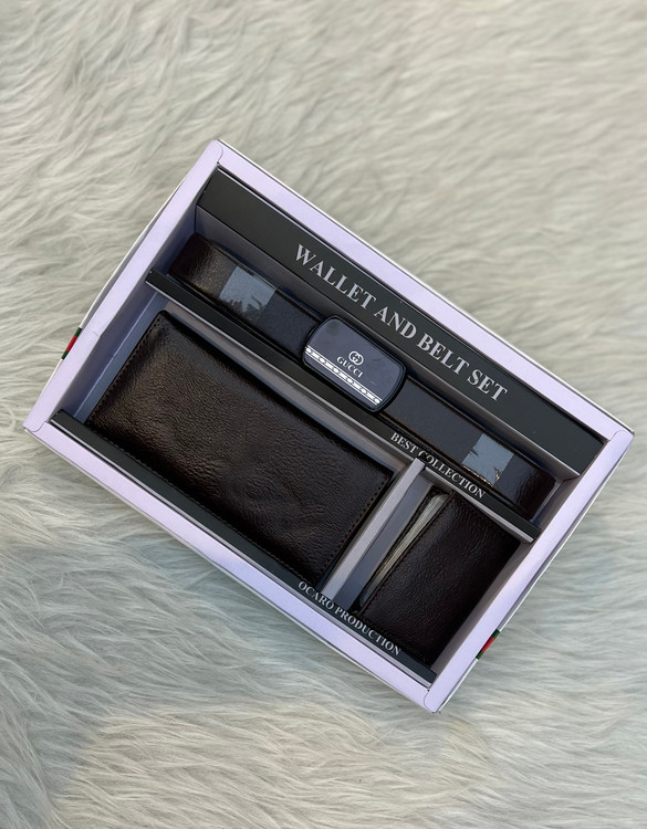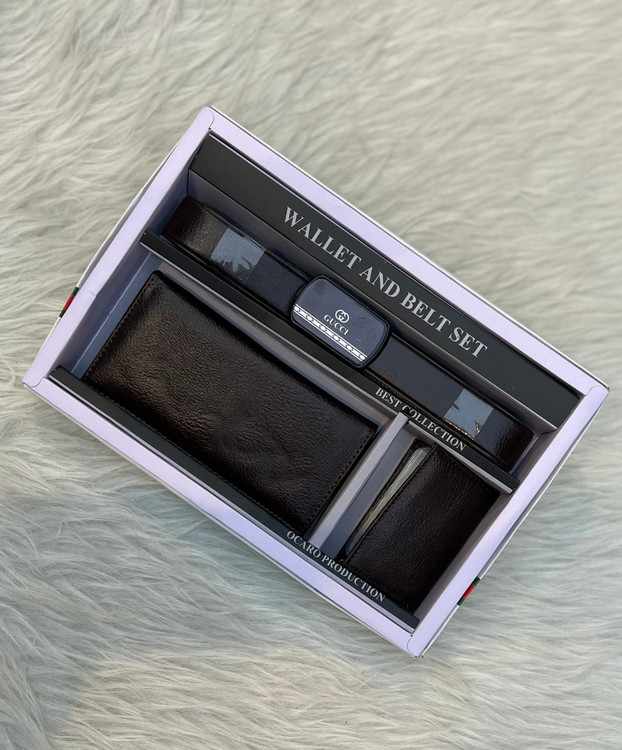 ست سه تیکه کیف پول کمربند جاکارتی چرم صنعتی رنگ قهوهای سوخته