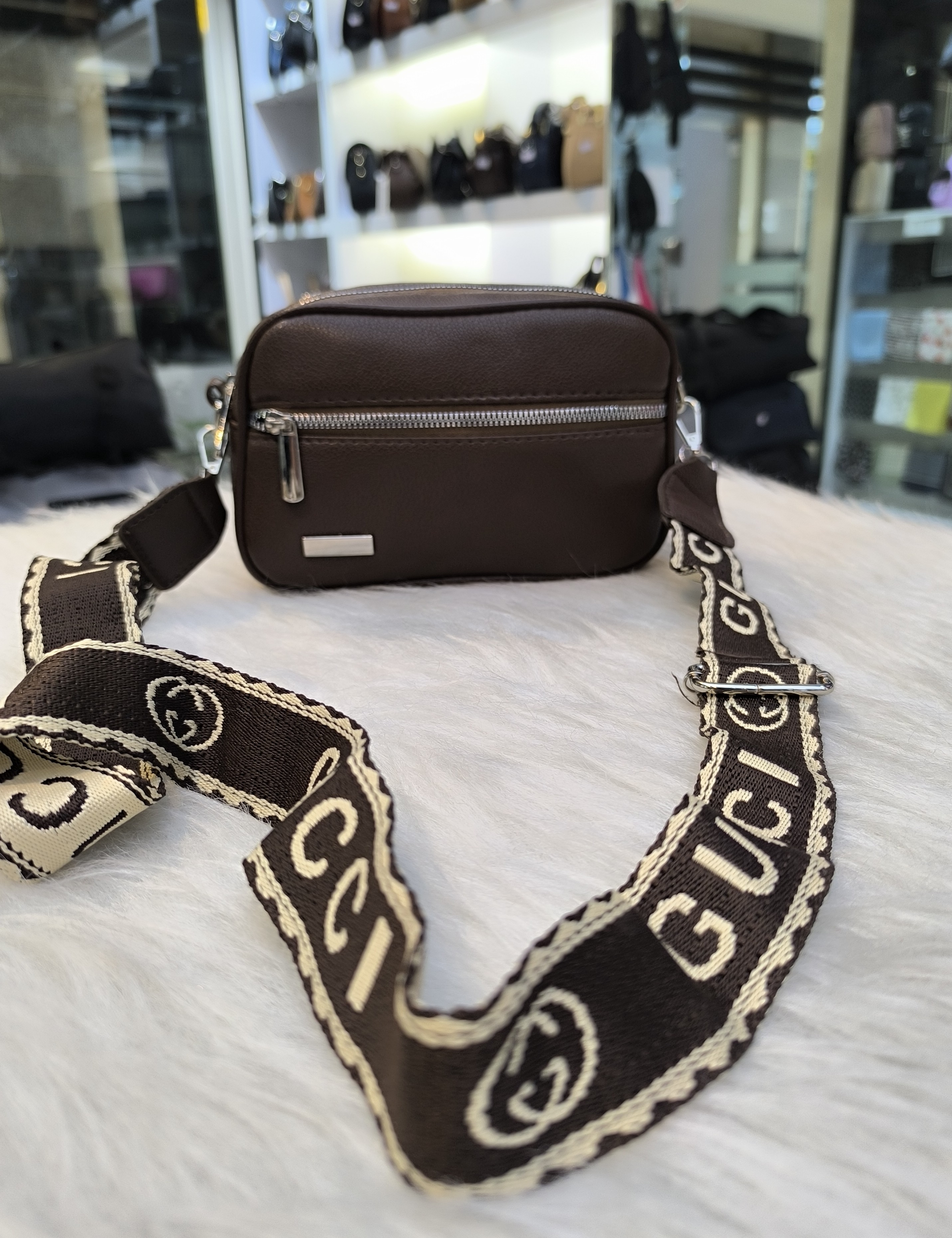 کیف دوشی زنانه جنس چرم خارجی رنگ قهوه ای مدل دوزیپ با بند پهن قابل تنظیم طرح دار